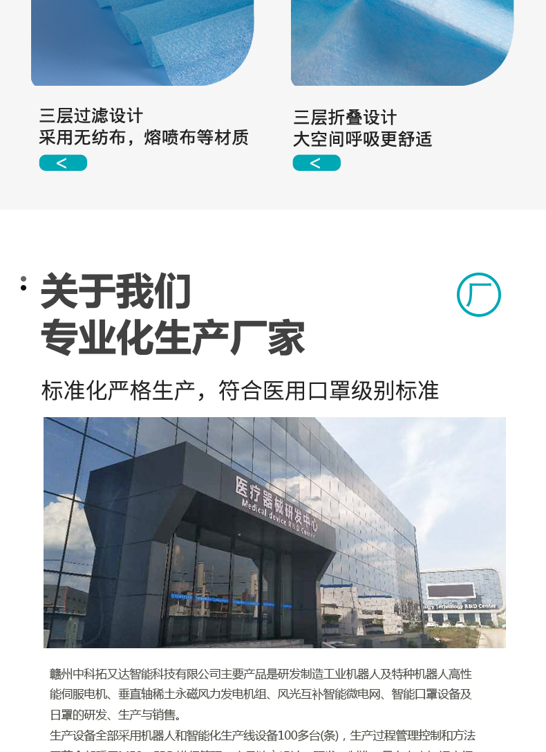 2020年初,新冠疫情爆发,我公司在危机来临时刻主动转产研发口罩生产设备,利用现有厂房,建设口罩洁净厂房3000平米,自制23套口罩自动生产线,建成年产100台(套)智能口罩生产线及日产300万片口罩项目,响应了国家、省、市、区的口罩物资调拨,为学校、医院、执法部门等单位捐赠了数百万片口罩,口罩设备及口罩产品远销俄罗斯、意大利等国,帮助其他口罩生产企业扩大了产能,在疫情期间为江西本土企业提供了口罩物资协助复工复产,为全国、省、市、区的疫情防控工作作出了重大贡献。中办国办调研组、省委书记刘奇、省长易炼红、省政协主席姚增科等国家和地方领导分别到我公司参观考察。