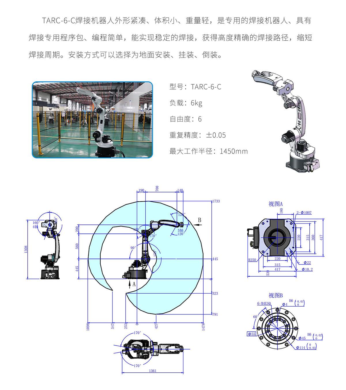 TARC-6-C welding robot is compact, small and light. It is a dedicated welding robot with welding program package and simple programming. It can achieve stable welding, obtain a highly accurate welding path, and shorten the welding cycle. The installation can be selected as ground, hanging , or upside-down.