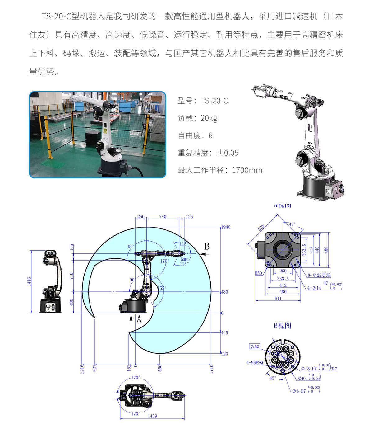 TS-20-C robot is a high-performance universal robot, which adopts an imported reducer (Sumitomo Japan). The characteristics of this robot is high precision, high speed, low noise, stable operation and durability. It’s mainly used for loading and unloading, palletizing, handling and assembly. Compared with other domestic robots, it has perfect after-sales service and quality.